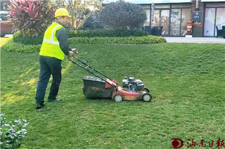 春節(jié)臨近,我市很多小區(qū)物業(yè)管理處與業(yè)主加強(qiáng)小區(qū)環(huán)境整治,美化環(huán)境。圖為陸河縣一小區(qū)園林工人在修剪草坪。