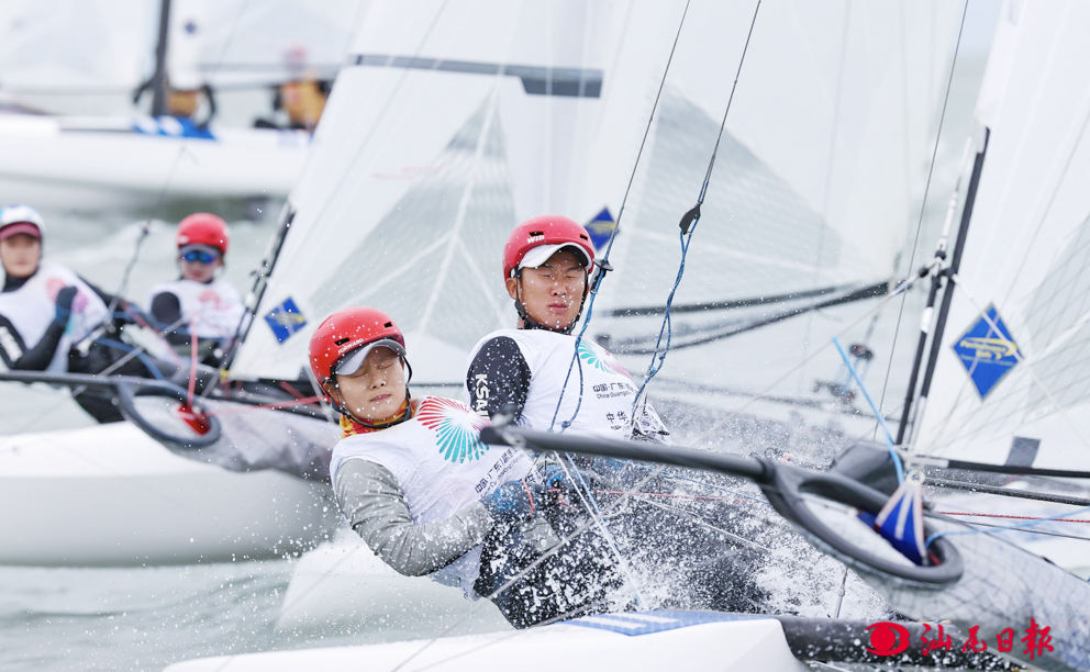 運動員駕馭帆船劈風(fēng)斬浪,奮勇前行。
