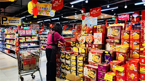 與此同時,年貨同樣熱銷。在一家商場內(nèi),紅色包裝的商品琳瑯滿目,餅干、水果尤其受到市民群眾的歡迎,不少市民熱衷選購紅色禮盒的餅干、水果。據(jù)該商場售貨員透露,該商超一天內(nèi)需要進行多次補貨,以保障商品供應。