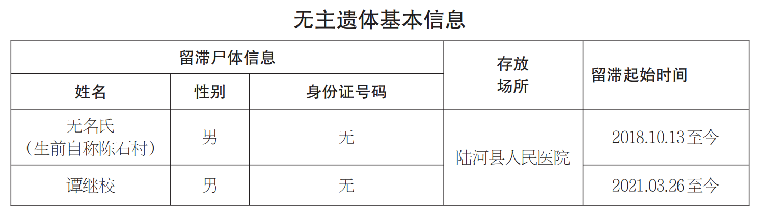 自公告發(fā)布之日起60個自然日內(nèi)仍無人認領(lǐng)的遺體,陸河縣人民醫(yī)院將按《民法典》《殯葬管理條例》等相關(guān)法侓法規(guī)規(guī)定,依法申請衛(wèi)生行政主管部門和公安機關(guān)將尸體處理。